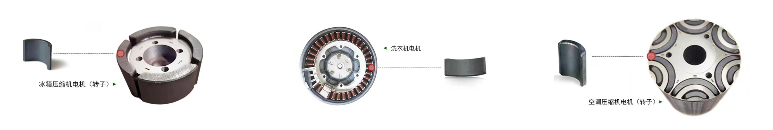 变频家电用电机(BLDC),原来都是使用高价位的钕铁硼磁铁,因为铁氧体磁铁性能的突破,并且价格低廉及居里温度的优势,几乎替代了钕铁硼,性能都为GC-9B牌号,剩磁430MT,内禀380KA/M如海信、海尔、三星洗衣机及空调都以涵盖。