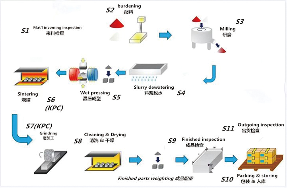 工艺绝不是简单地走流程,而应该是源于对细节的严苟挑战!完整的工艺流程,更强化了工艺的各个细节,除整个生产过程按PPAP控制外,还有成型、烧结等工席分别采用数控装置和启动控制,与监测系统监控生产全过程,以工艺细节成就品质。